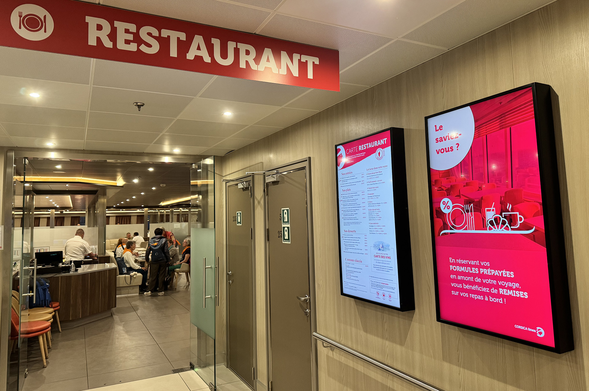TEVEO combines all the tools for interactive entertainment and communication services for passengers in cabins (TV, VOD, information portal, photo/video gallery of tourist attractions, etc.) and the dissemination of information in key areas (restaurant, bar, corridors / decks …) within a single solution.
